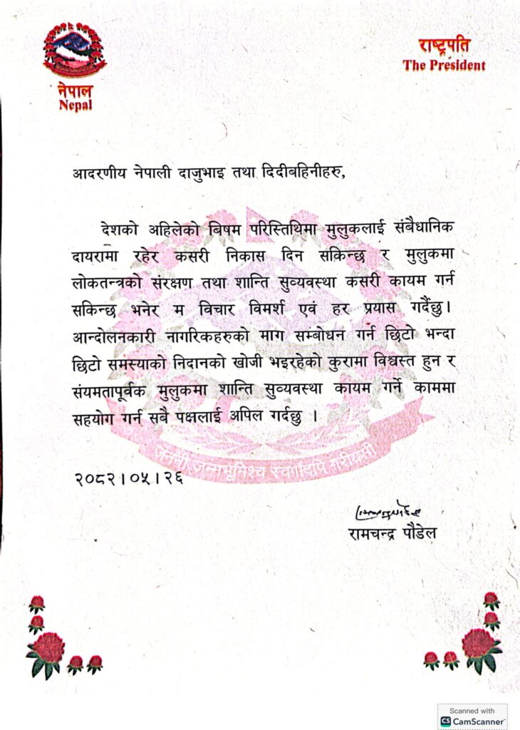 समाचारराष्ट्रपति रामचन्द्र पौडेलको पौडेलको विज्ञप्ति Ramkumar Pyakurel6 months ago6 months ago01 mins Post navigation Previous: प्रिय युवा !Next: महत्त्वपूर्ण दस्तावेजहरू करिबकरिब नष्ट : सर्वोच्च अदालत Leave a Reply Cancel replyYour email address will not be published. Required fields are marked *Comment * Name * Email * Website Save my name, email, and website in this browser for the next time I comment.